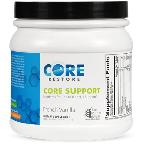 Core Support is scientifically formulated with clean macronutrients, key phytonutrients, fiber and alkalinizing factors to enhance Phase II liver detoxification and Phase III elimination of xenobiotics and xenoestrogens.